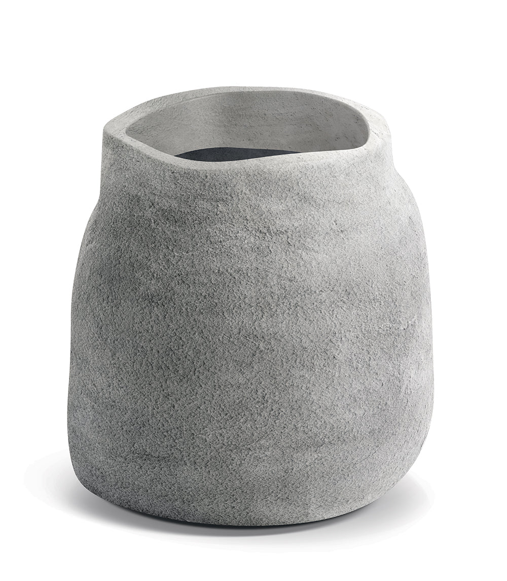 Nieregularna krawędź płynnie przechodzi w miękkie, obłe linie korpusu, przywodząc na myśl gładkie kamienie ukształtowane przez wodę. Matowa powierzchnia z subtelną, chropowatą strukturą podkreśla naturalny charakter donicy, nadając jej szlachetnej autentyczności – jakby została stworzona wprost z surowca natury.