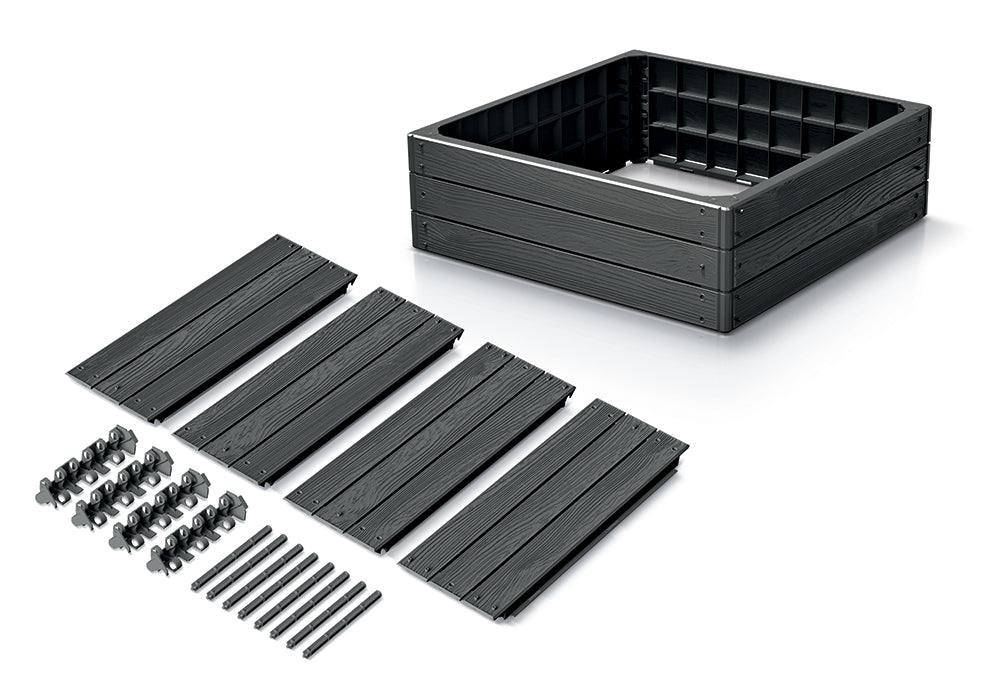 Łącząc elementy ze sobą wzwyż, można stworzyć grządki podniesione dopasowane do aranżacji otoczenia, pozwalające jednocześnie na ergonomiczną pracę na wygodnej wysokości.